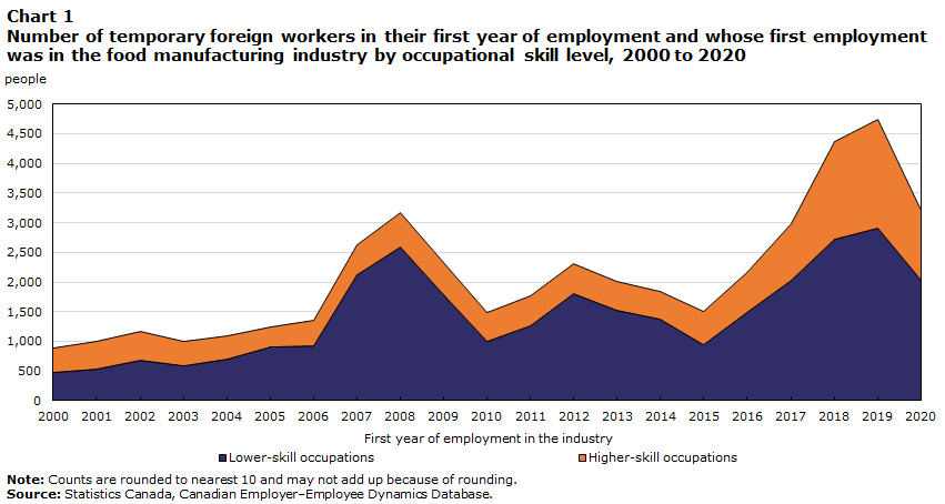 To shed light on these issues, this study focuses on TFWs with lower-skill occupations in the food manufacturing sector and examines their rate of transition to permanent residency and their rate of retention in the industry one to five years after becoming permanent residents. It analyzed work permit holders with lower-skill occupations whose first employment was observed in food manufacturing from 2000 to 2020 and made comparisons with TFWs who held higher-skill occupations in the same industry.Note TFWs’ occupational skill requirement levels were based on the occupation information from their work permits. When the occupation information is unavailable, the annual earnings in the TFW’s first employment year were used to impute occupational skill requirement levels (See Data appendix for details).
